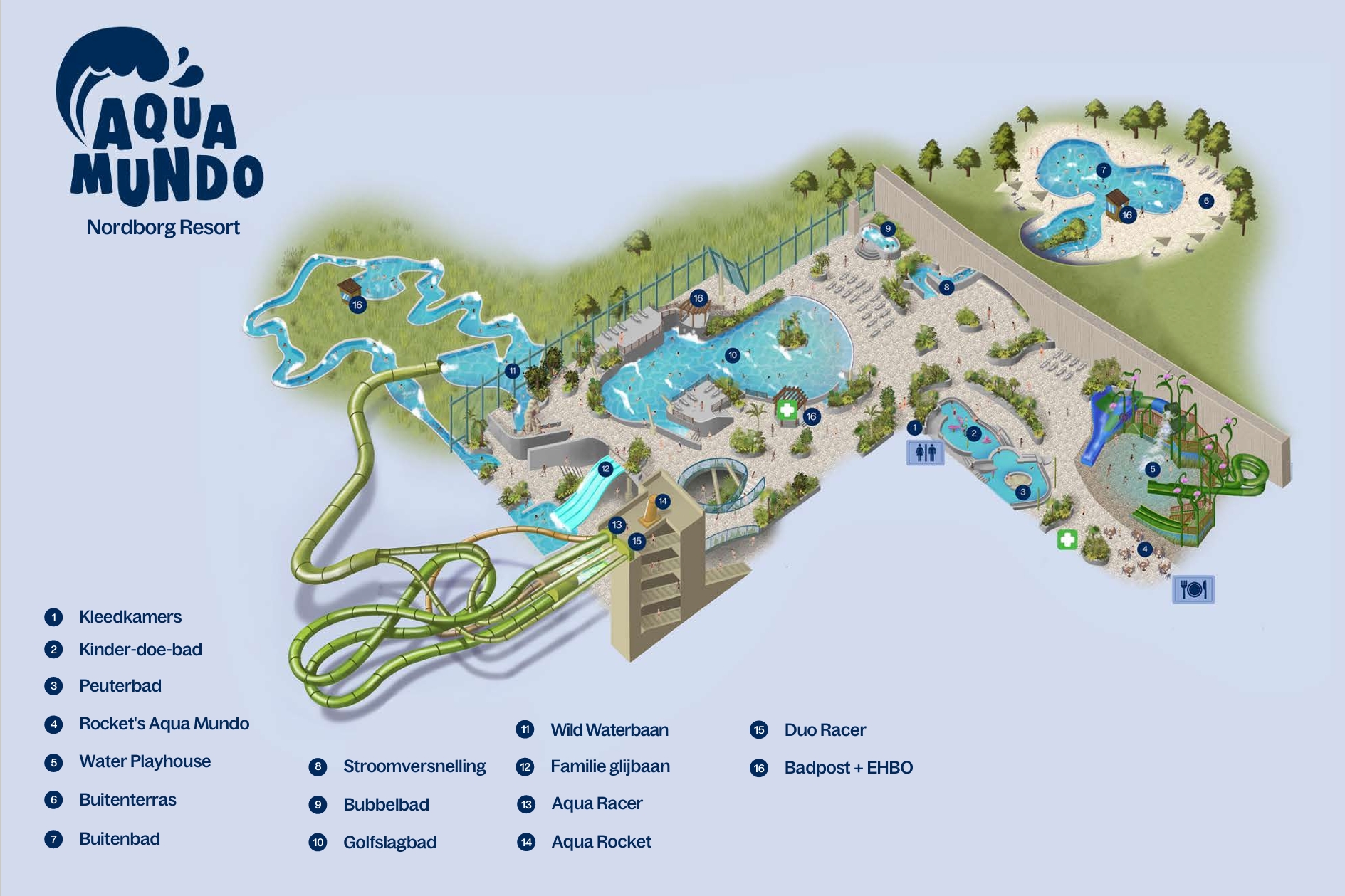 Of je nu naar beneden suist op de 90 meter lange Duo Racer glijbaan, de golven trotseert in het golfslagbad of meegesleurd wordt door de wildwaterbaan, Aqua Mundo biedt zo veel meer dan een klassiek zwembad. De 152 meter lange Aqua Racer zorgt voor spanning met snelle bochten, terwijl de 57 meter lange Aqua Rocket een adrenalinekick geeft met hoge snelheden. Met in totaal vier afwisselende glijbanen en de avontuurlijke wildwaterbaan is Aqua Mundo een wereld vol plezier, verwondering en puur vakantiegeluk.